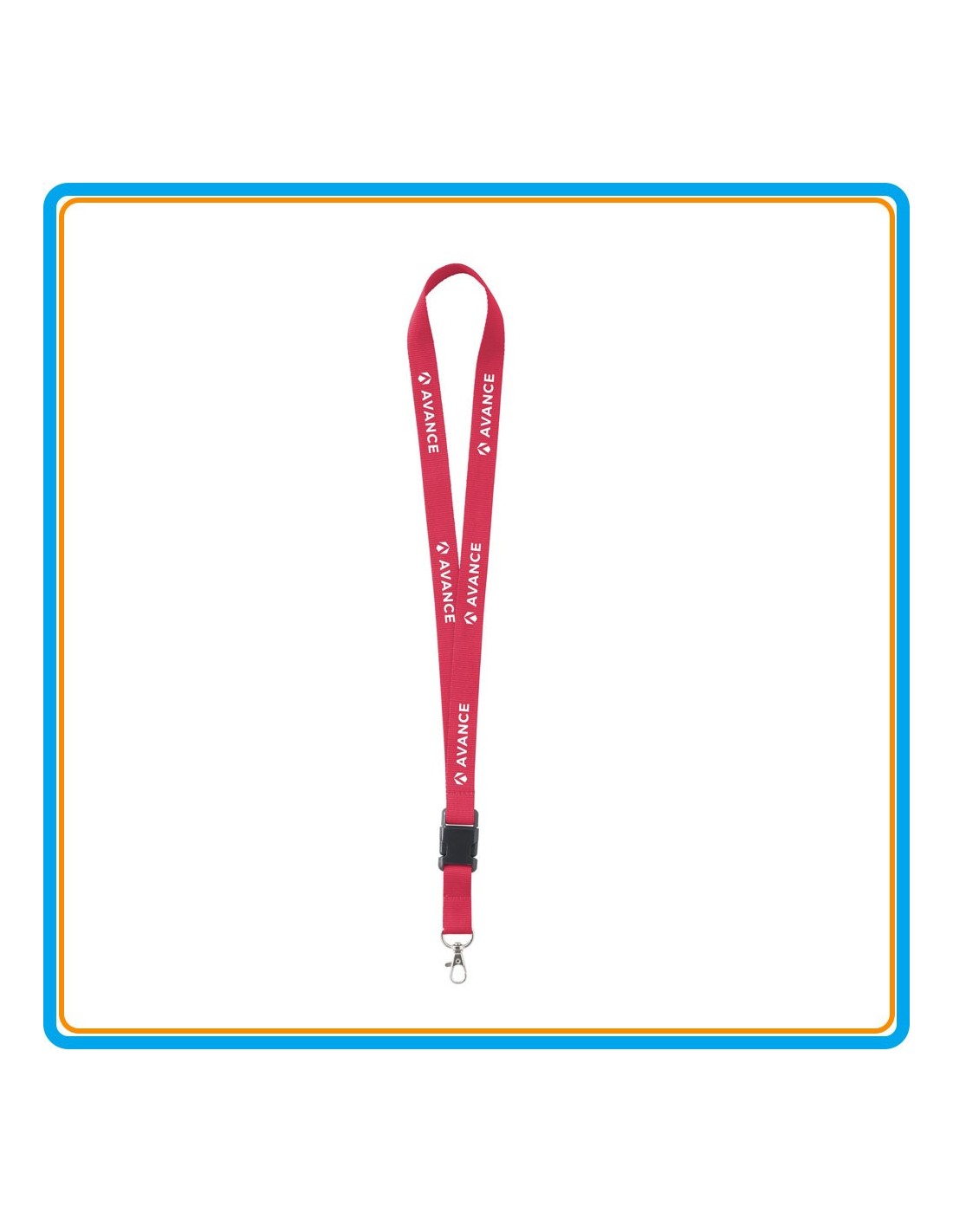 Lanière tour de cou clip en finition polyester d'une largeur de 2 cm, avec un mousqueton métallique et un clip détachable. Ce mécanisme permet de détacher rapidement la partie basse en cas de besoin, pour ouvrir une porte par exemple.