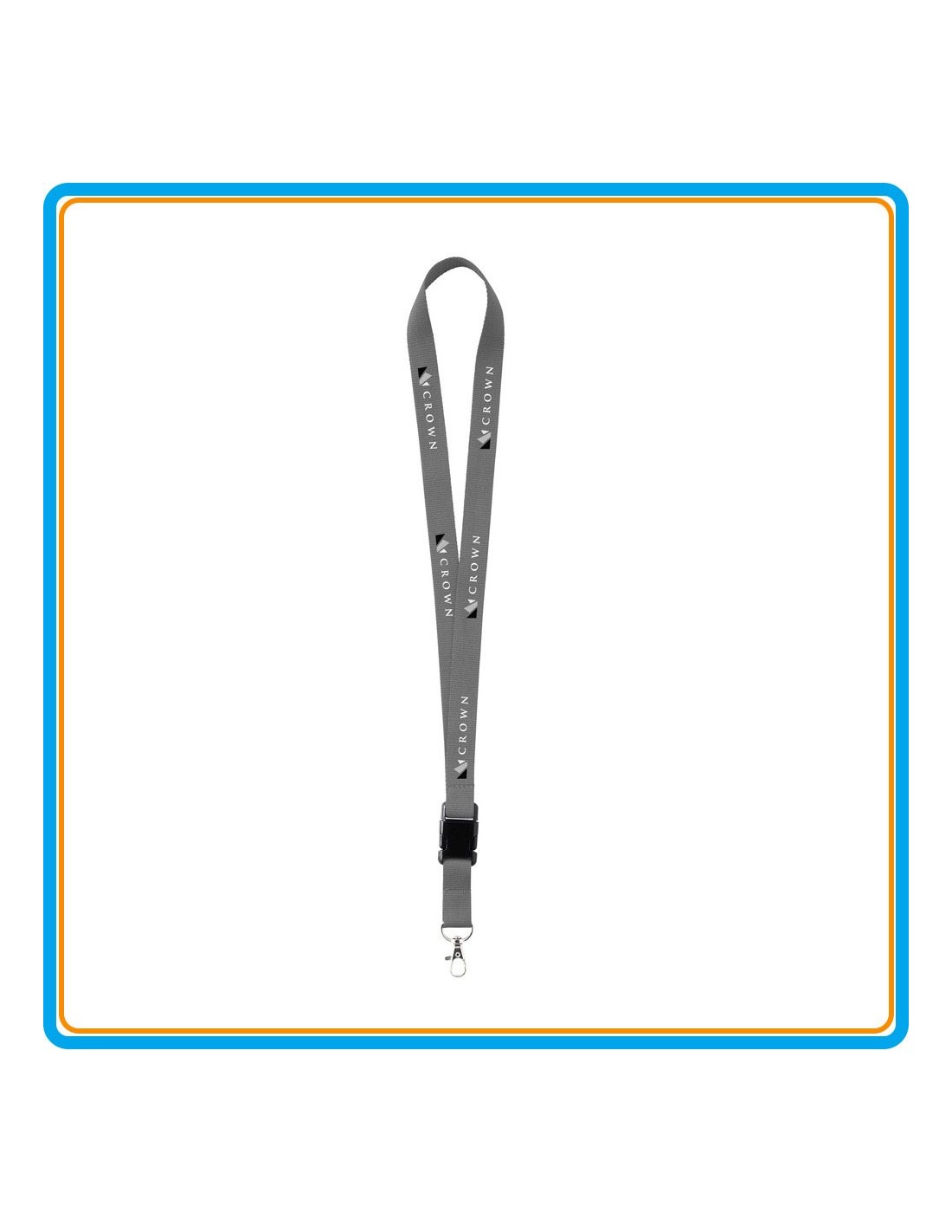 Lanière tour de cou clip en finition polyester d'une largeur de 2 cm, avec un mousqueton métallique et un clip détachable. Ce mécanisme permet de détacher rapidement la partie basse en cas de besoin, pour ouvrir une porte par exemple.