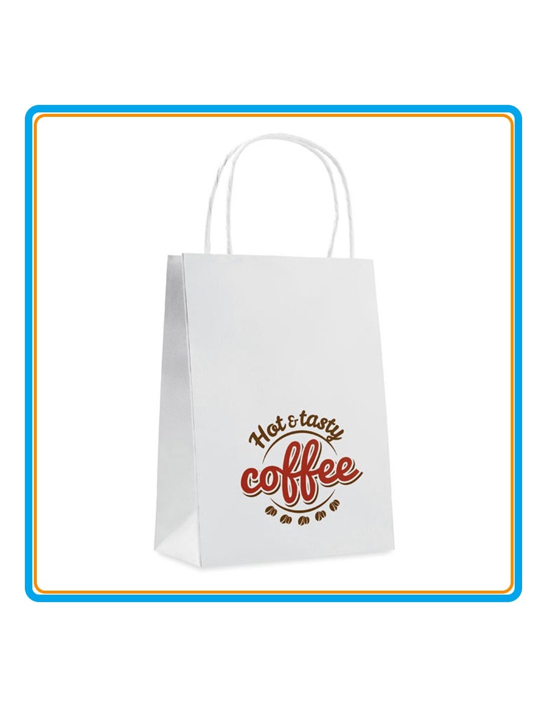 Sac papier publicitaire Small fabriqué en papier 150 g avec anse torsadée et soufflets sur les cotés. Ce format Small est Idéal pour remettre de petits objets en boutique ou lors de foires et véhiculer ainsi votre image de marque.