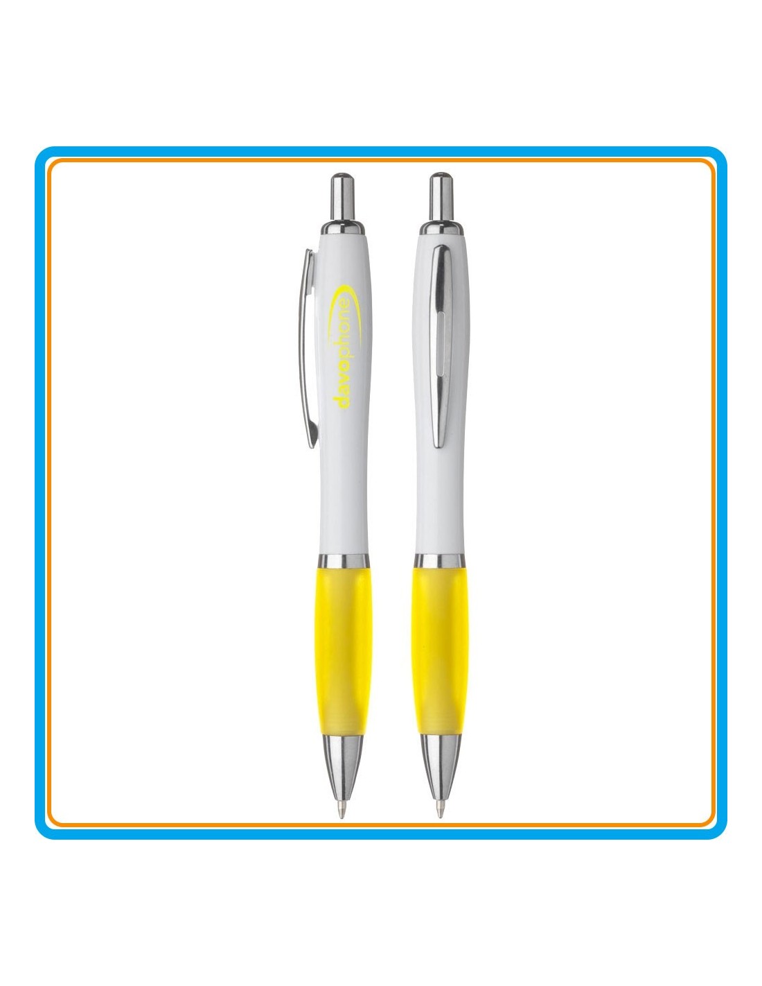 Le stylo bille Athos White propose pour sa finition une association d'un corps en ABS blanc opaque avec un grip de préhension antidérapant coloré. Les attributs de ce stylo publicitaire destiné à la grande diffusion sont un clip métal, d'une part, et des éléments de couleur chromée, d'autre part.